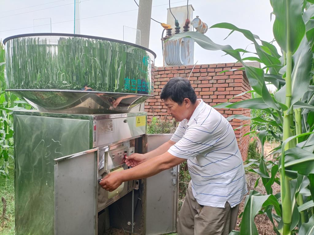 魏县种粮大户王耀河正在维护高空杀虫灯。(受访单位供图)