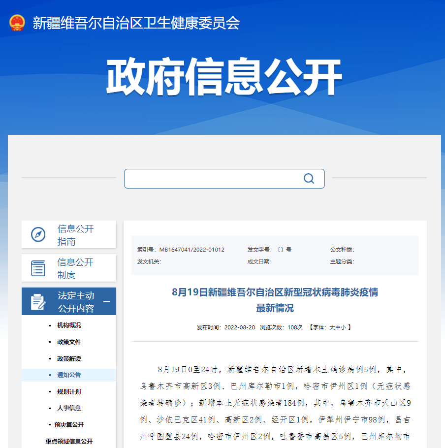 8月19日0至24时,新疆维吾尔自治区新增本土确诊病例5例,其中,乌鲁木齐市高新区3例、巴州库尔勒市1例,哈密市伊州区1例(无症状感染者转确诊);新增本土无症状感染者184例,其中,乌鲁木齐市天山区9例、沙依巴克区41例、高新区2例、经开区1例,伊犁州伊宁市98例,昌吉州呼图壁县24例,哈密市伊州区2例,吐鲁番市高昌区5例,巴州库尔勒市2例。新增本土无症状感染者解除隔离医学观察124例,其中,乌鲁木齐市天山区32例、沙依巴克区22例、水磨沟区13例、高新区6例、经开区2例、达坂城区1例,伊犁州伊宁市24例、伊宁县1例,塔城地区乌苏市5例、额敏县1例,博州博乐市1例,昌吉州呼图壁县5例,吐鲁番市高昌区7例,阿克苏地区新和县1例、拜城县3例。
