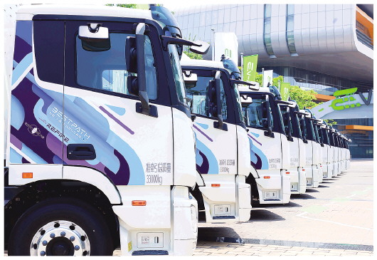 ▲重塑集团与福田汽车合作投运的一批42吨氢燃料电池重卡。(受访者供图)