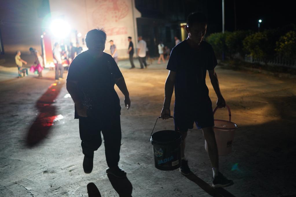 装满的水桶立即被提走或挑走,每户来回四五趟,多的七八趟。一名村民新买了3个大桶、家里总共有10个桶装水,但因为家里人多,两天一次的送水依然觉得紧张。他说:“都必须省着用,洗菜水喂猪、洗澡水拖地,洗澡也只能是打湿了毛巾擦擦身子。”
