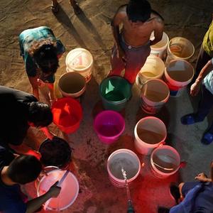 十几只五颜六色、大小不一的水桶瞬间摆在车旁。看着一个个水桶被清澈的水装满,村民们脸上泛起笑容。