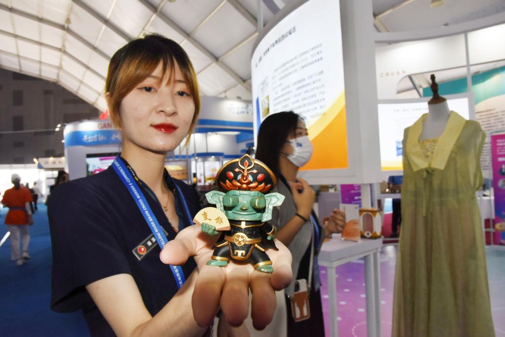 8月26日,以“梦起黄河 同心共赢”为主题的2022年黄河流域跨境电商博览会在青岛开幕。图为参展商在博览会上展示三星堆文创产品。新华社记者 李紫恒 摄