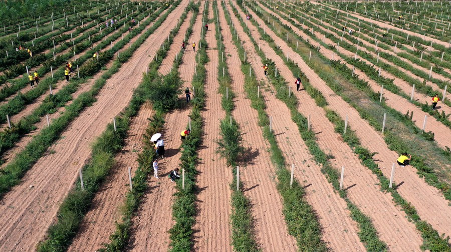游客在银川市永宁县闽宁镇棚湖湾红树莓基地采摘红树莓(2021年9月4日摄,无人机照片)。新华社记者 王鹏 摄