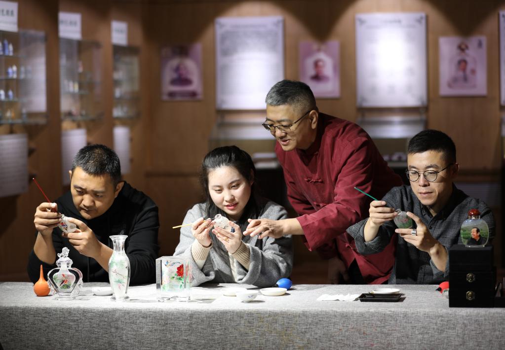 “方寸之内显日月,股掌之上惹人怜。”这句诗形容的就是内画。创作时,画师需要从内径极窄的壶口伸入画笔,在水晶容器磨砂内壁上反向绘画。2006年,衡水内画被列入第一批国家级非物质文化遗产名录。