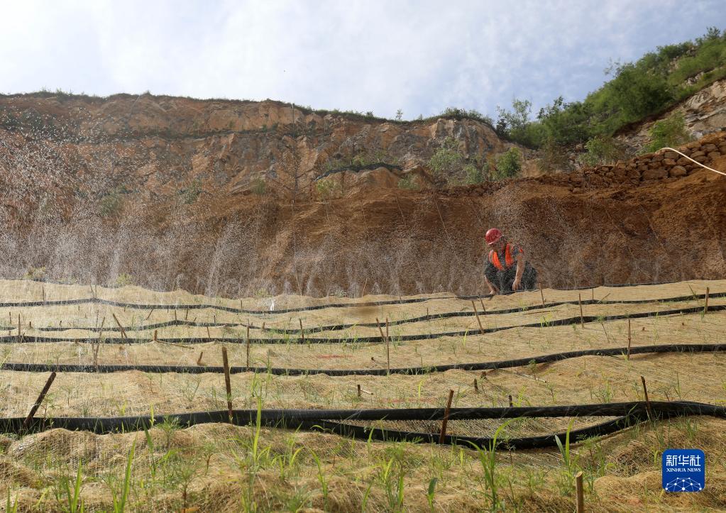 2022年6月2日,在位于石家庄市井陉县威州镇南固底村的河北省太行山区矿山掌子面治理技术试验项目现场,工作人员在检查喷淋设备。新华社记者 骆学峰 摄
