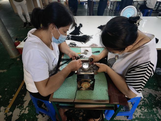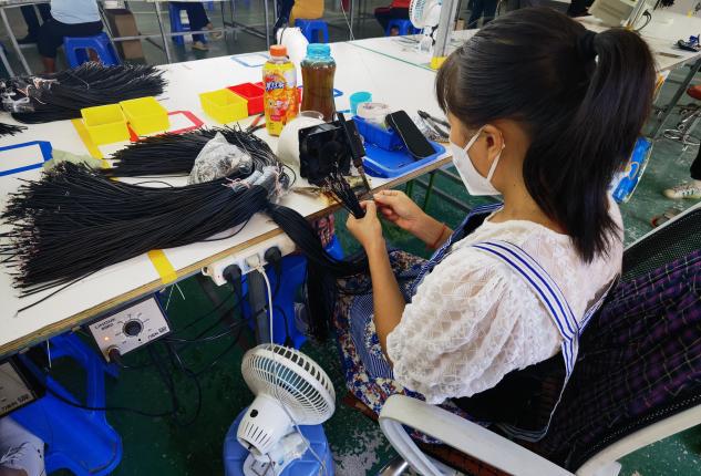 图为润格电子富民车间内,村民正在制作电线(唐斓 摄)