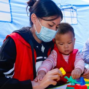 9月7日,在四川省甘孜州泸定县磨西镇地震救灾安置点,志愿者陪伴孩子们在青青儿童乐园玩耍。新华社记者 沈伯韩 摄