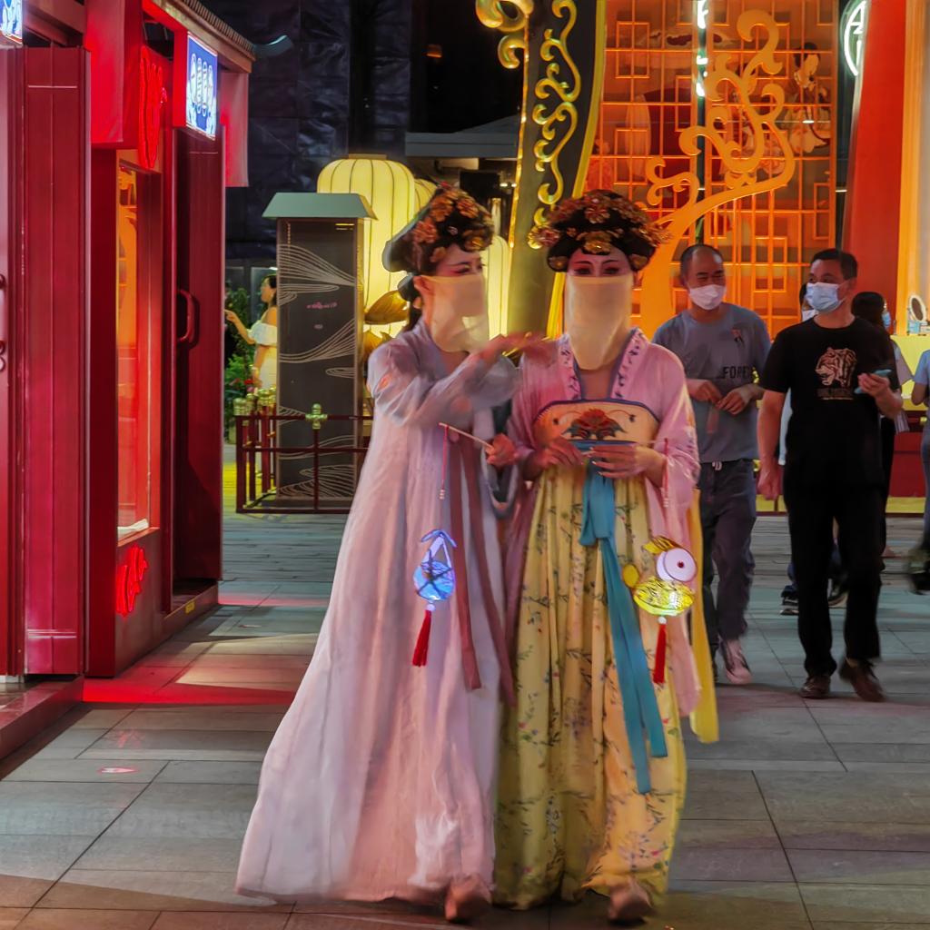 “对于中华儿女来说,明月负载着悠久的神话传说和深邃的文化内涵,中秋节以月之圆兆人之团圆,为寄托思念故乡,思念亲人之情,祈盼丰收、幸福,是丰富多彩、弥足珍贵的文化遗产。” 大唐不夜城景区工作人员宋立姣说,“同时,今年中秋为了减少人群聚集,我们还减少大型表演,增加‘快闪’式的小规模表演,灵活穿插在街区,让人们能够随走随看,像在流动的画卷中游览。”