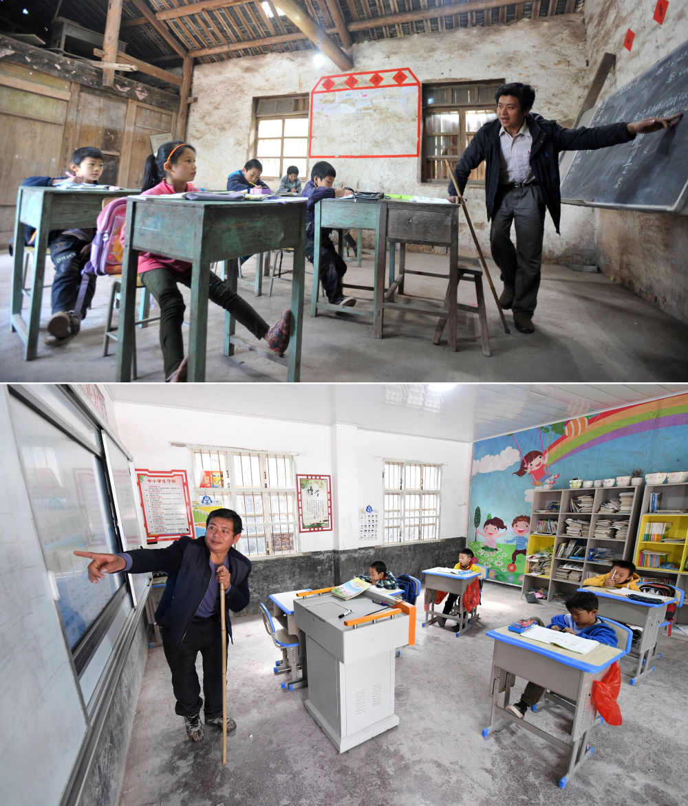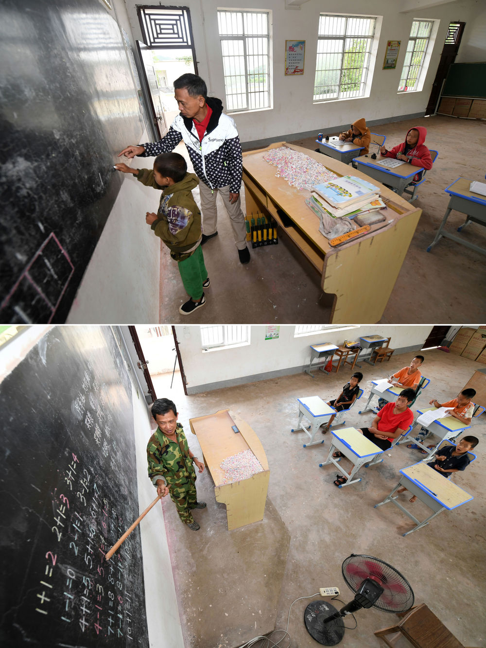 上图:在广西灵川县海洋乡小平乐中心岐教学点,秦兴国老师在给学生上课(2013年3月27日摄)。下图:在广西灵川县海洋乡安泰教学点,秦兴国老师在给学生上课(2021年10月28日摄)。
