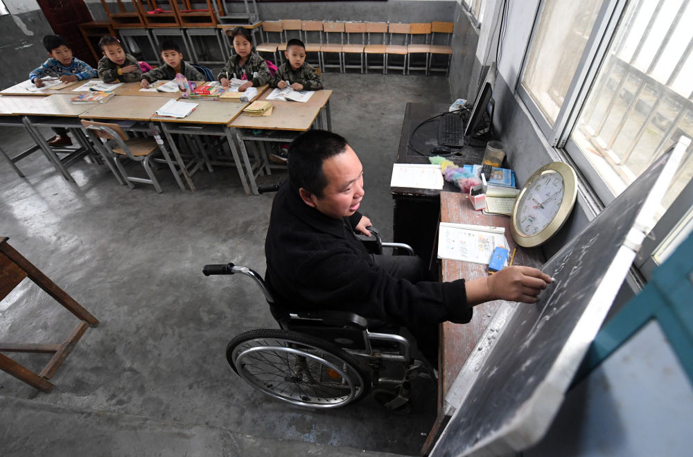 在广西凌云县下甲镇河洲村念恩小学,阮文凭老师坐在轮椅上给学生上课(2019年3月26日摄)。