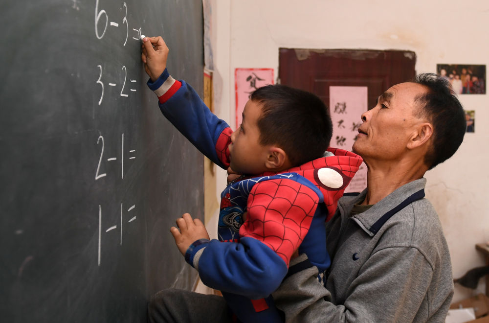 在广西融水苗族自治县汪洞乡新合村达佑教学点,学校唯一的老师周宏军抱着一名够不着黑板的学生做课堂作业(2019年5月28日摄)。