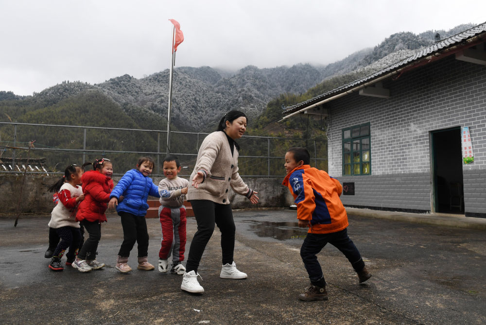 在广西灵川县兰田瑶族乡东良教学点,石夏月老师和学生在做游戏(2022年2月24日摄)。