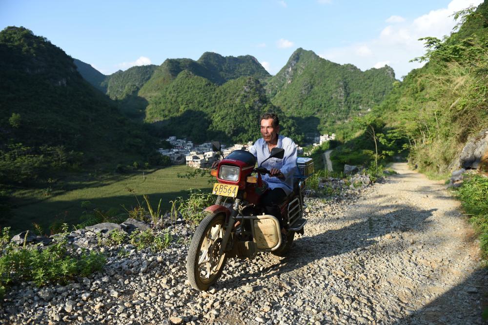 在广西天等县宁干乡黎明村明屯教学点,梁正文老师在放学后骑车回家的路上(2015年6月16日摄)。