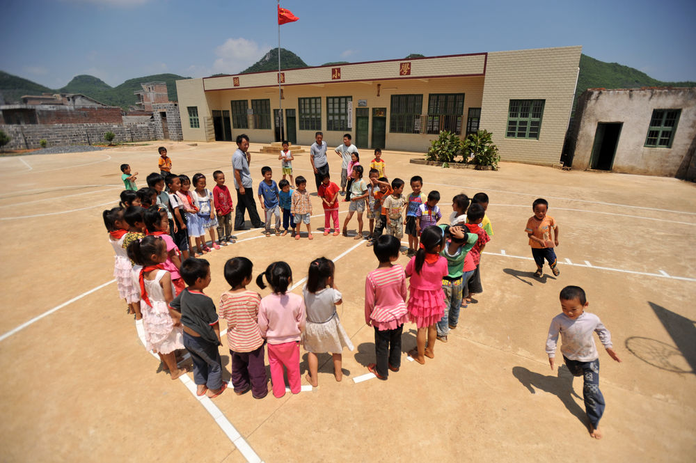 湖广小学师生在校园里做游戏(2013年6月19日摄)。湖广小学位于湘桂边界,师生有的来自湖南,有的来自广西,有“一校跨两省区、两省区辖一校”之称。