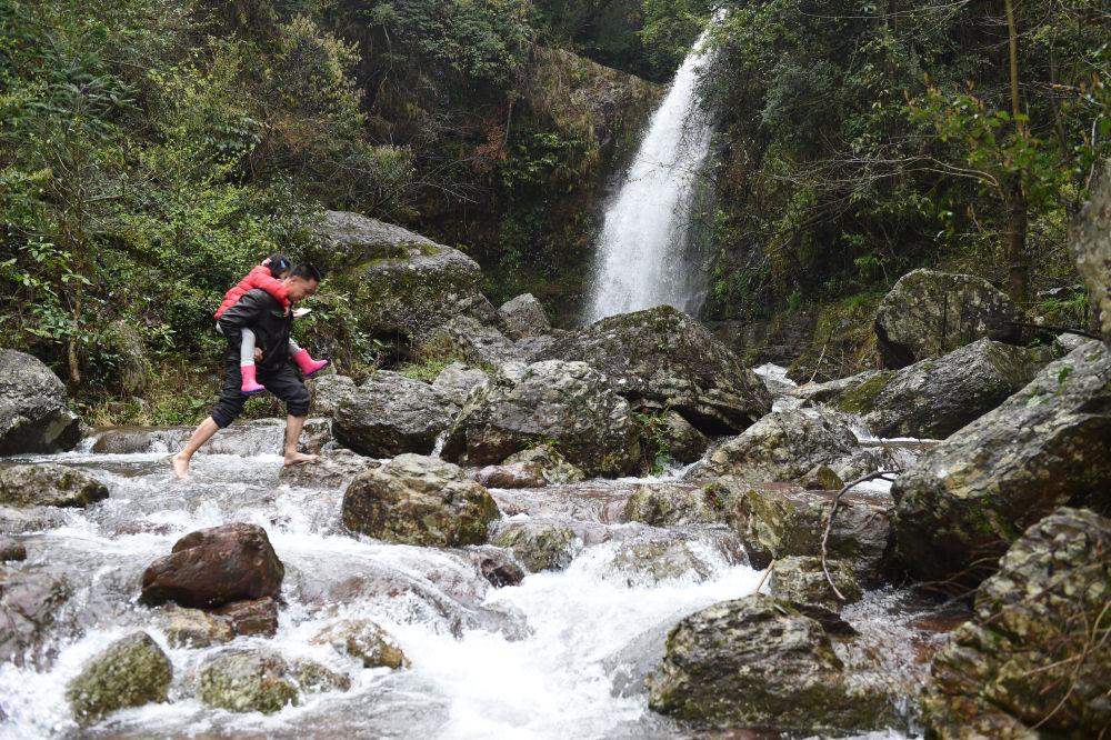 在广西灌阳县洞井瑶族乡野猪殿村,野猪殿村小学老师周运雄放午学后背着一名学生走过被流水淹没的路段回家(2016年3月22日摄)。