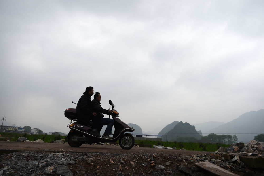 在广西灌阳县洞井瑶族乡,桂平岩小学老师赵仁斌(前)用电单车将杨大杰老师载去学校的路上(2016年3月24日摄)。2015年3月,杨大杰被诊断为股骨头坏死,经过一段时间治疗病情有所缓解后,他坚持带病回到教学岗位上。