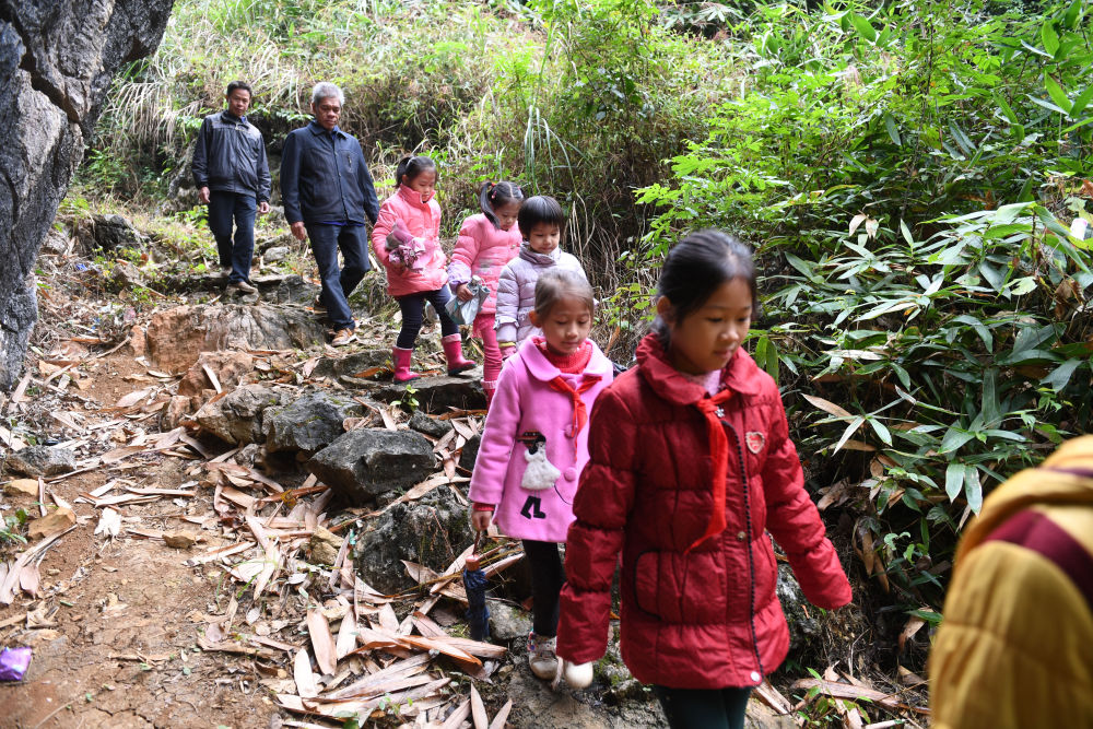 广西大新县宝圩乡那排教学点覃诚老师(左二)和覃永忠老师(左一)陪同学生走山路回家(2017年11月24日摄)。