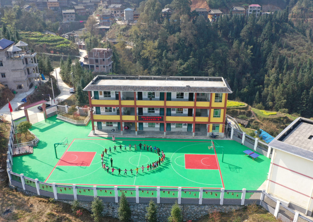 登晒小学师生在课间一起做游戏(2019年3月12日摄)。登晒小学地处黔桂边界,同属贵州省黎平县龙额镇和广西壮族自治区三江侗族自治县富禄苗族乡,是黔桂共建的一个教学点,师生有的来自贵州,有的来自广西,有“一校跨两省区、两省区辖一校”之称。