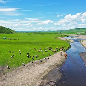 在科右前旗乌兰毛都大草原,不时可见成群的牛羊。这里按16亩一只羊、80亩一头牛的标准核定草原载畜量,牧民获得每亩近4元的草畜平衡补贴。