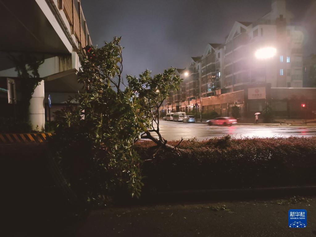 9月14日晚拍摄的浙江省舟山市普陀区东港海洲路绿化带上被风吹倒的树木(手机照片)。新华社发 (邢守秒 摄)