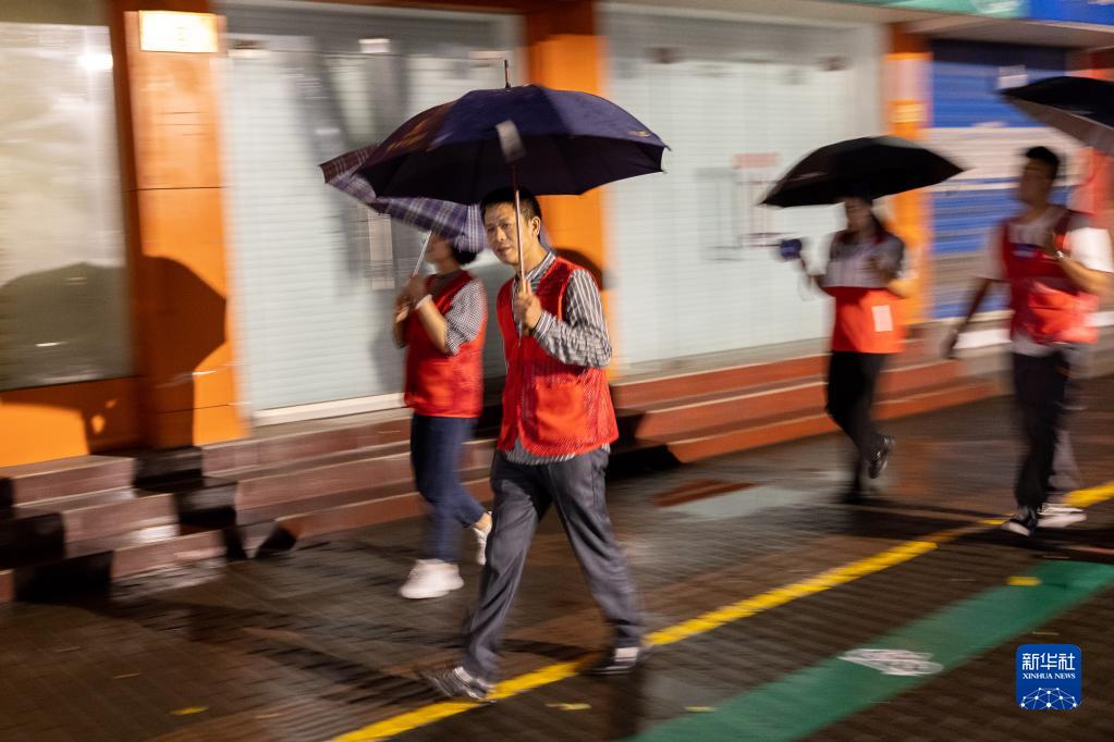 9月14日晚,在浙江省湖州市吴兴区飞英街道塔下街社区,党员志愿者在老旧小区排查高空坠物、开展夜间防台巡查工作。新华社发(伊凡 摄)