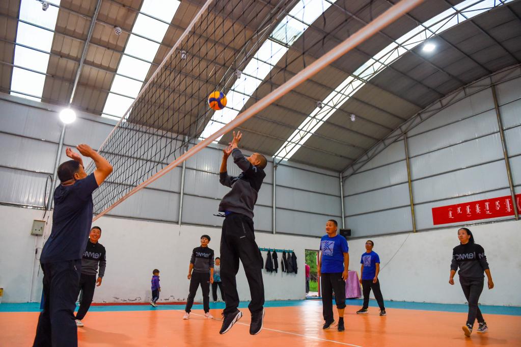 8月30日,农牧民们在排球馆内打球。新华社记者彭源摄