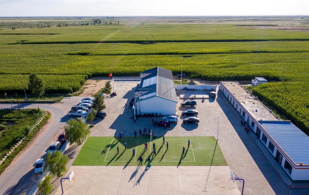 8月30日,农牧民们在内蒙古鄂尔多斯市鄂托克前旗昂素镇巴彦希里嘎查的排球场上打球(无人机照片)。新华社记者连振摄
