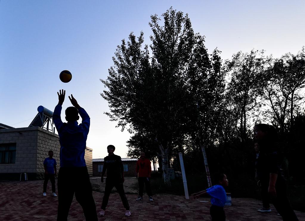 8月30日,在呼格吉拉图家,农牧民们在室外练习排球。新华社记者连振摄