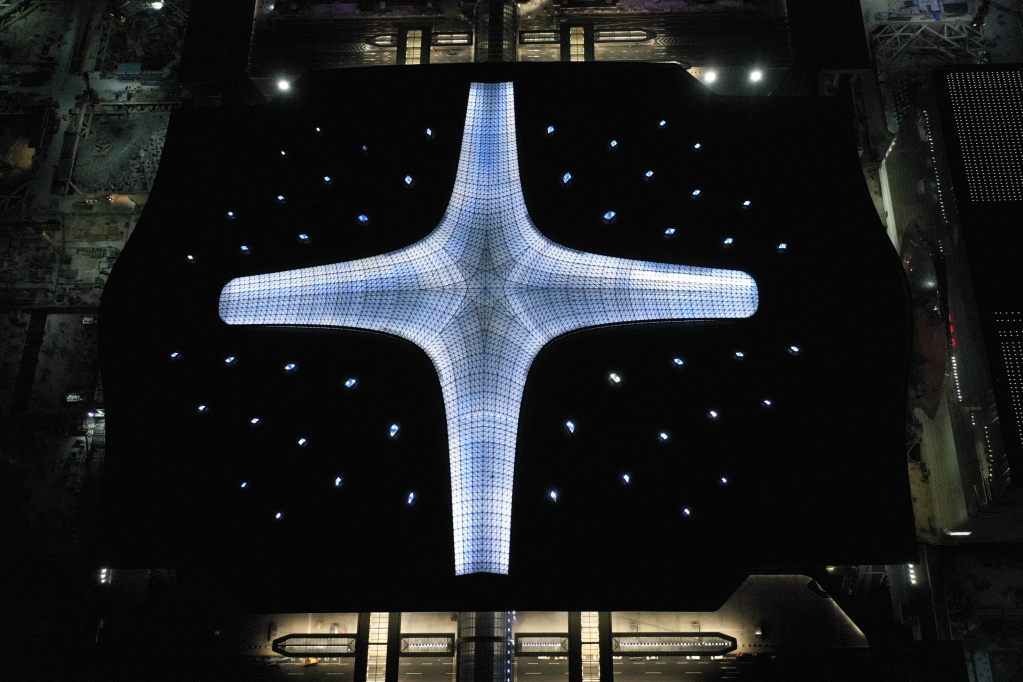 从空中俯瞰杭州西站,白色屋顶与光伏板的组合极具视觉冲击,夜晚降临灯光亮起,蓝色色调更增添了建筑的独特魅力。