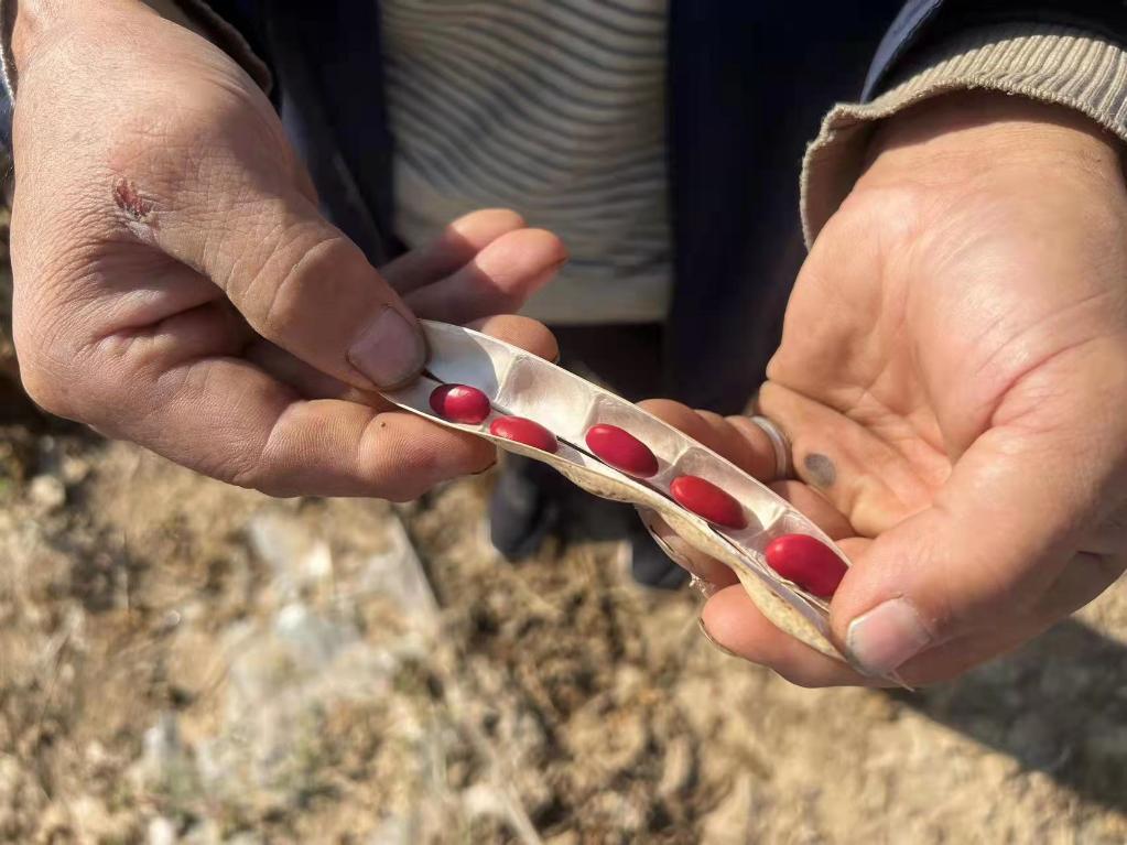 9月15日,在山西省岢岚县焦山村,村民武玉贵展示今年刚收获的红芸豆。(新华社记者柴婷 摄)