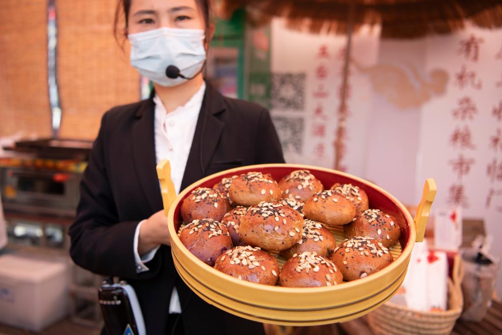 9月22日,在位于山西省忻州市忻府区小檀村的杂粮美食节现场,工作人员展示一款杂粮面包。(新华社记者杨晨光 摄)