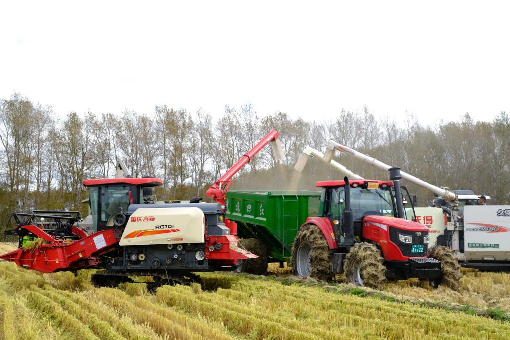 北大荒集团普阳农场有限公司种植户贾如家的稻田正在收割。新华社记者黄腾摄