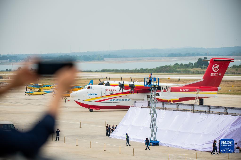 9月27日,一名观众在拍摄“鲲龙”AG600M。新华社记者 伍志尊 摄