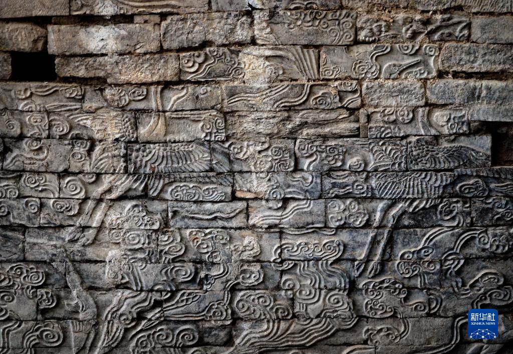 这是巨幅石雕祥瑞壁画上的编码,在宋代砌筑时起到防止壁画错乱的作用(拼版照片,9月21日摄)。新华社记者 李安 摄