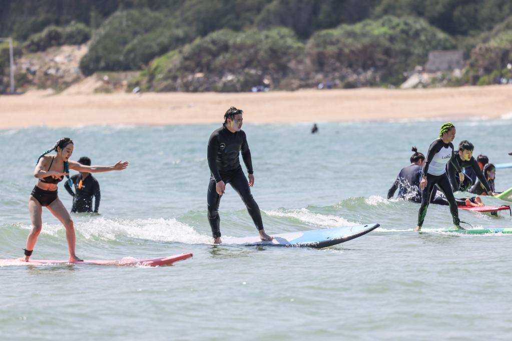 游客在海南三亚皇后湾海域体验冲浪运动。新华社记者 张丽芸 摄