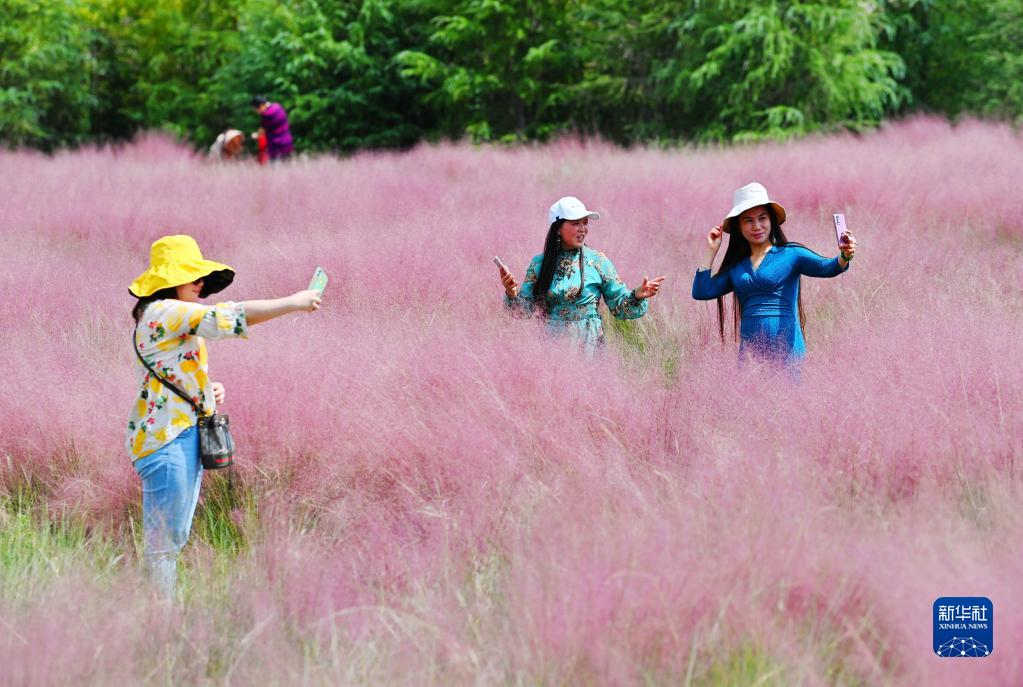 9月29日,游客在重庆市酉阳土家族苗族自治县叠石花谷粉黛花海景区游玩。新华社发(陈碧生 摄)