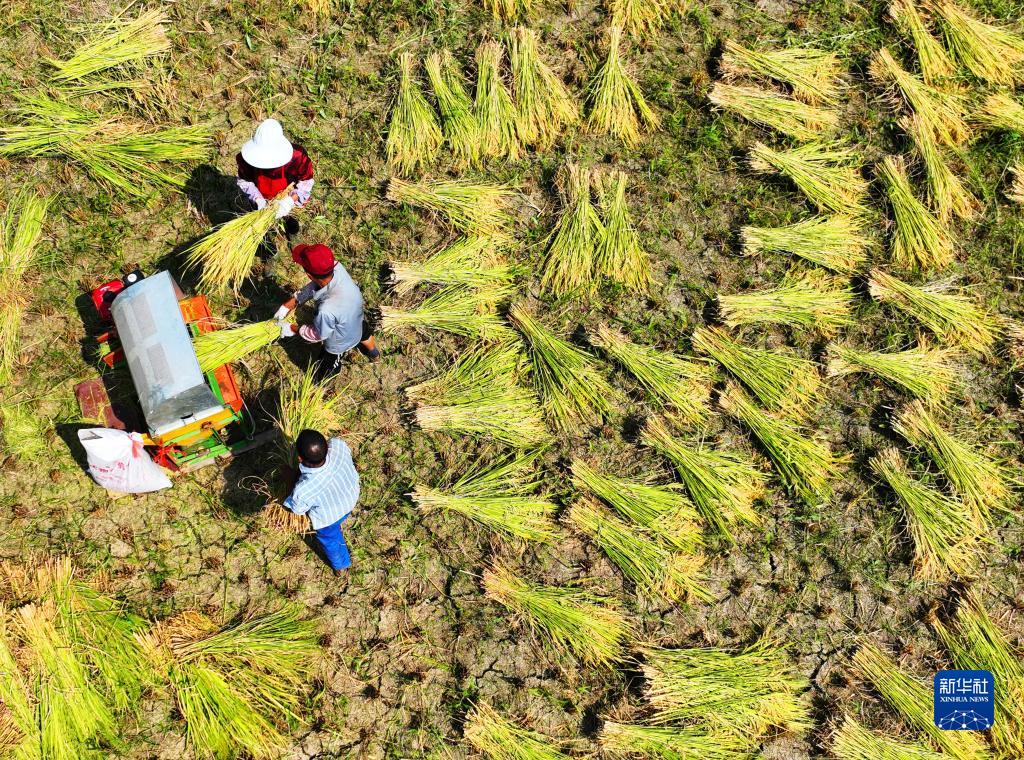 重庆市酉阳土家族苗族自治县花田乡何家岩村农民在收割稻谷(2022年9月12日摄)。新华社发(陈碧生 摄)