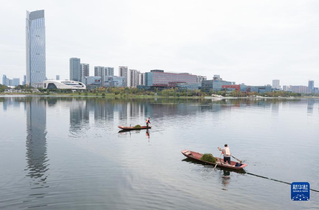 金秋时节,四川天府新区兴隆湖,4500余亩水面波光粼粼,湖水清澈见底,几根水草随波漂荡。管护员赖小利站在小船上,熟练地伸出长杆网兜一捞一翻一抖,水草便被甩上船。