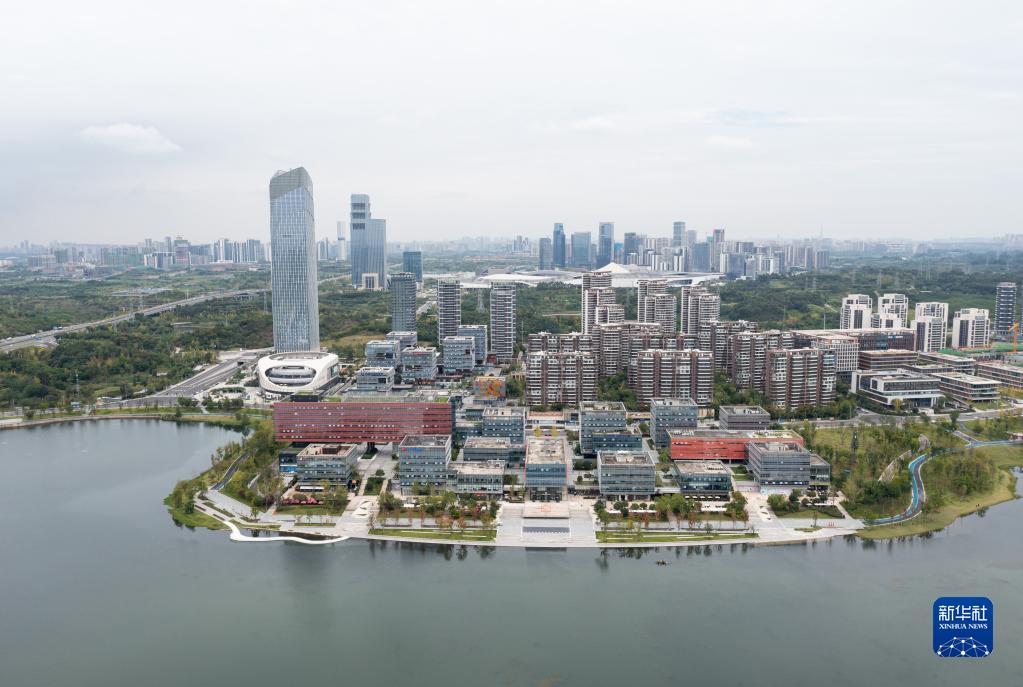 俯瞰四川天府新区兴隆湖畔的科研机构建筑大楼群(2022年9月21日摄,无人机照片)。新华社记者 江宏景 摄
