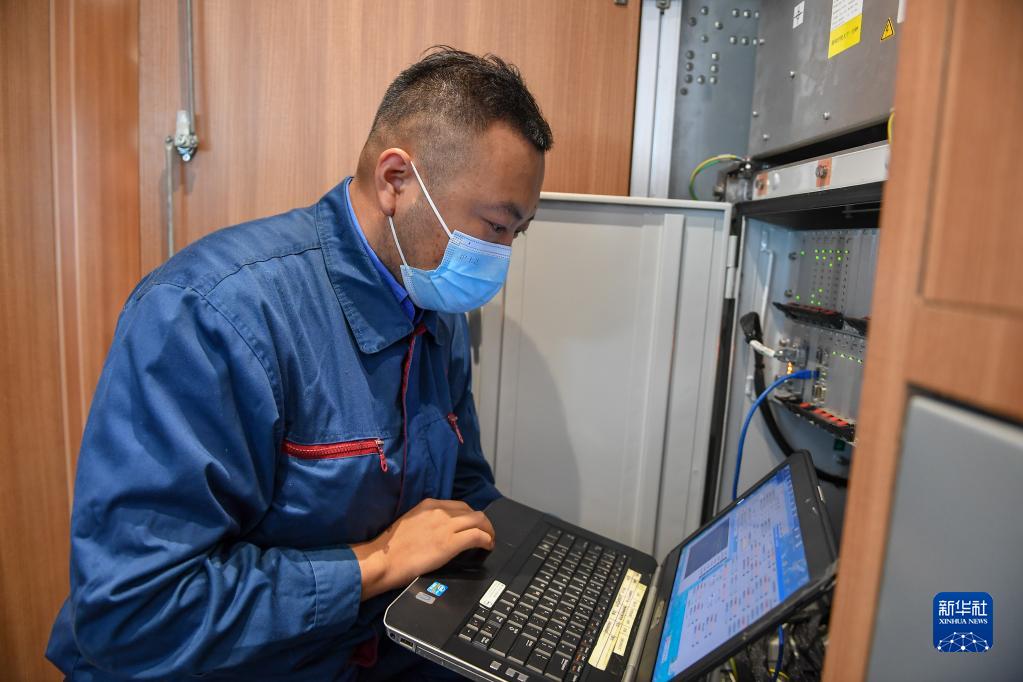 10月2日,在长春动车运用所,技术人员朱磊检查列车设备。新华社记者 张楠 摄