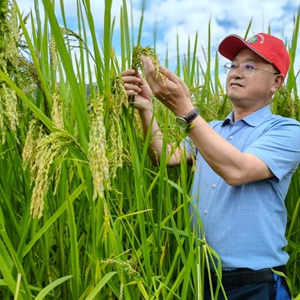 除了传统的高秆水稻品种,科学家也在积极选育高秆水稻新品种。在巨型稻收割前,云南省农业科学院粮食作物研究所所长李小林走进稻田,对水稻根系进行观察取样,并站在比他还高的水稻旁拍照存资。