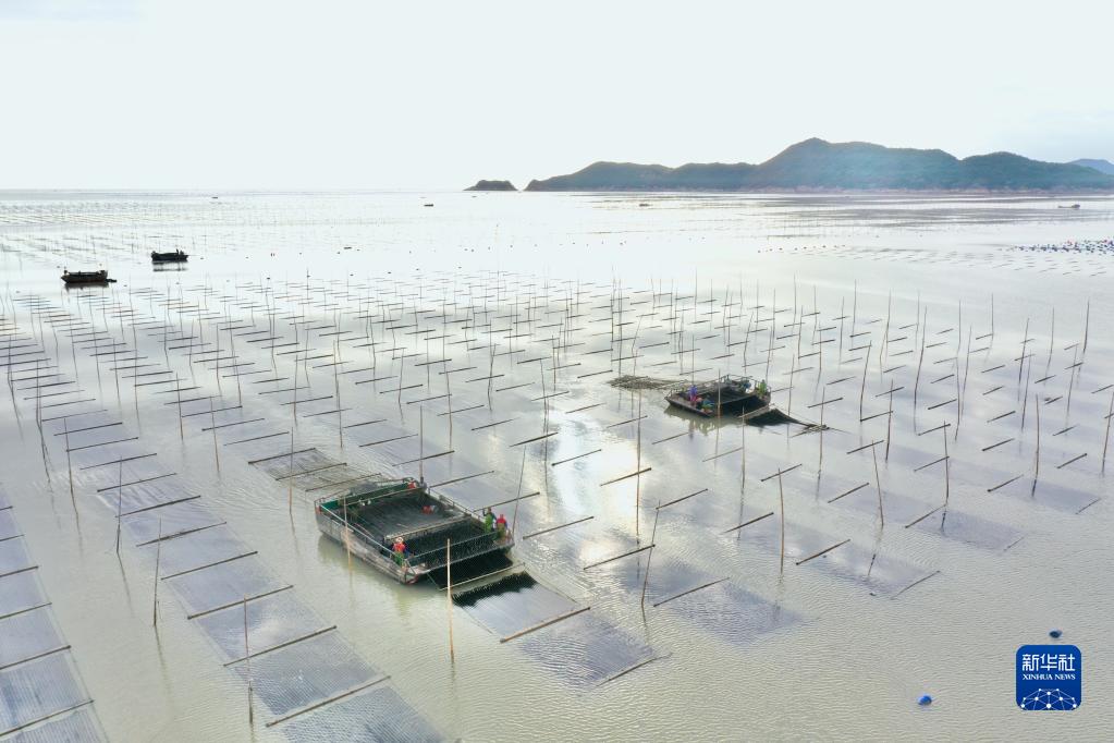 金秋十月,福建省宁德市霞浦县6.5万亩海上养殖紫菜迎来收获时节,渔民们操作收割船在大海中采收头水紫菜,展开一幅海上秋收画卷。霞浦县素有“中国紫菜之乡”美誉,形成紫菜育苗、种植、加工全产业链条,年产值近10亿元。紫菜成为当地群众增收致富的支柱产业。