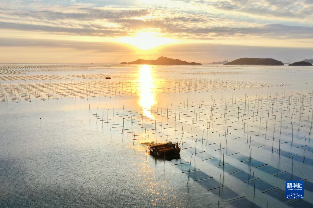 10月21日,福建省霞浦县松山街道沙塘街村渔民在朝阳照耀的大海上收割头水紫菜(无人机照片)。