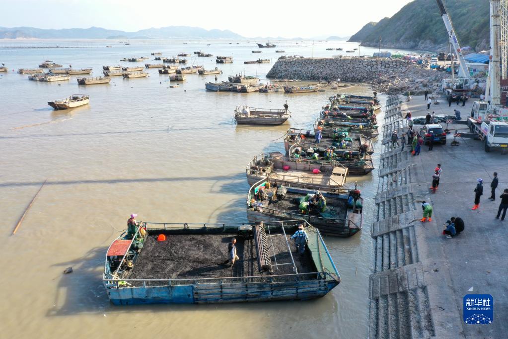 10月21日,渔民在福建省霞浦县松山街道沙塘街村码头装运新收割的头水紫菜(无人机照片)。