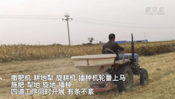 同时,撒肥机、耕地犁、旋耕机、播种机轮番上马,施肥、犁地、旋地、播种,冬小麦播种有条不紊,田间地头一派热火朝天的农忙场景。