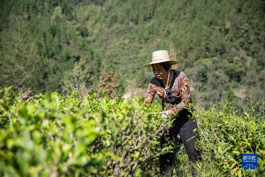 10月11日,在重庆市城口县咸宜镇青龙村,村民在为茶园除草。新华社记者 黄伟 摄