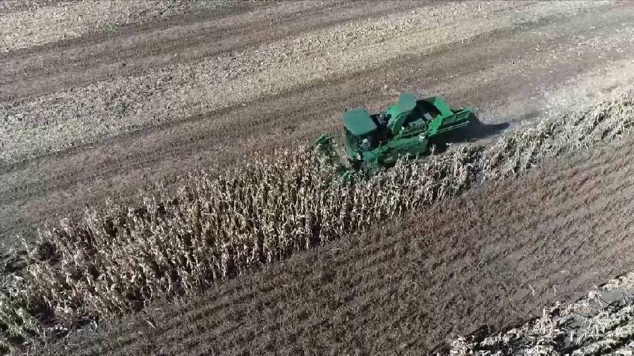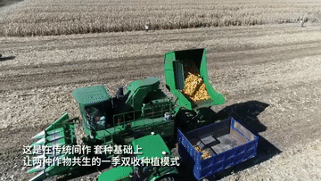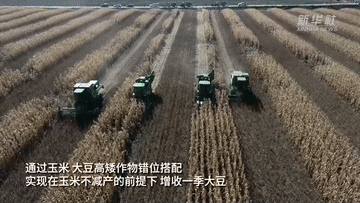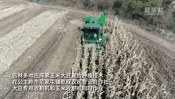 吉林多地还探索玉米大豆复合种植技术。在公主岭市范家屯镇乾程农民专业合作社,大豆专用收割机和玉米收割机同时作业。这是在传统间作、套种基础上,让两种作物共生的一季双收种植模式。通过玉米、大豆高矮作物错位搭配,实现在玉米不减产的前提下,增收一季大豆。