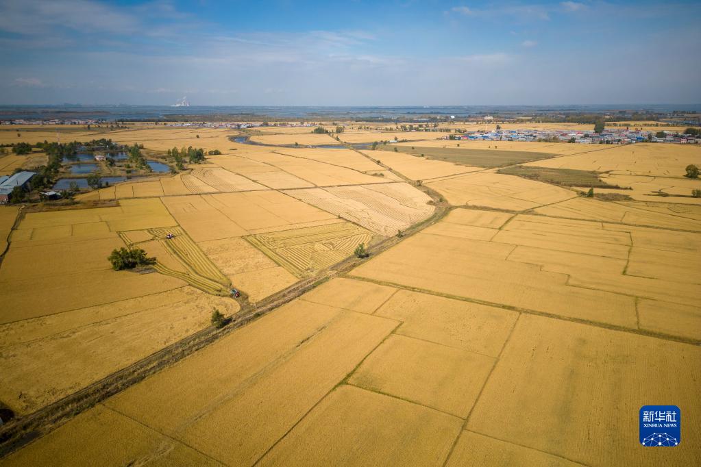 9月22日,在北大荒集团普阳农场有限公司,农机在收获水稻(无人机照片)。新华社发(刘洪军 摄)