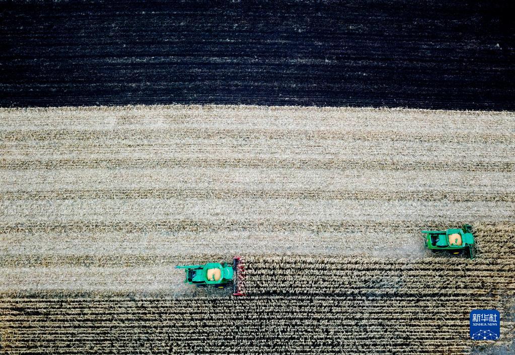 10月15日,在黑龙江省拜泉县国富镇自治村,农机在收获玉米(无人机照片)。新华社记者 王建威 摄