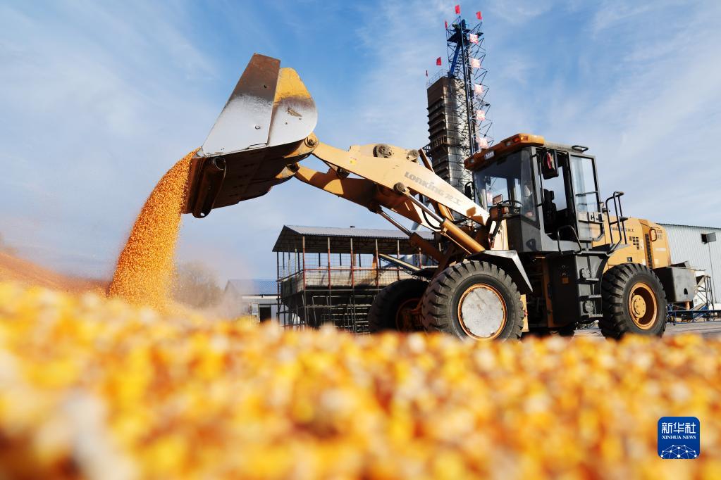 10月20日,在北大荒农垦集团有限公司北安分公司赵光农场有限公司,铲车在一处晒场倾倒玉米。新华社记者 王建威 摄